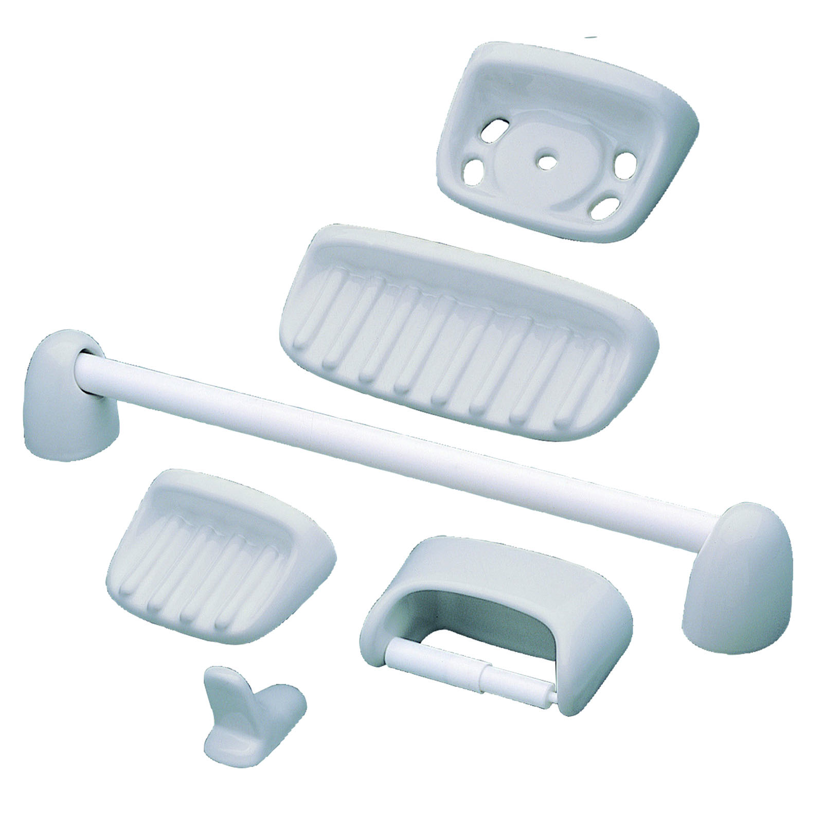 - Juego que incluye: portacepillo, jabonera, portarrollo, gancho para ropa, toallero de 60 cm, jabonera para ducha-tina. Incluye tubo de silicona de 70 gr. (para instalación). Fabricado en porcelana sanitaria vitrificada. Esmaltado en todas sus áreas visibles. Absorción de las piezas inferior a 0.5%. Espesor mínimo de 6 mm en cualquier parte de la pieza. Sin defectos, picaduras, fisuras o deformaciones. Color: Gris.